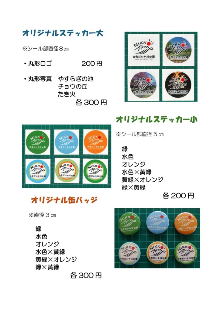 ◆オリジナルグッズにカラーステッカーと缶バッジが加わります◆ コメントする / 未分類 / By daiyagawa 緑あふれるやすらぎの池、桜咲くチョウの丘、キャンプ場のたき火の温もり…公園の風景と、季節の色をまとったカラーステッカーと缶バッジが新登場です! シンプルでポップなデザインはPCやスマホ、バッグなどのデコレーションにもぴったり。公園で過ごした楽しいひとときの記念に、ご家族やご友人へのおみやげに…数量限定のため、お早めにお買い求めください。 販売場所:キャンプ場売店、緑の相談所、だいや体験館 過去のグッズ紹介ページへ