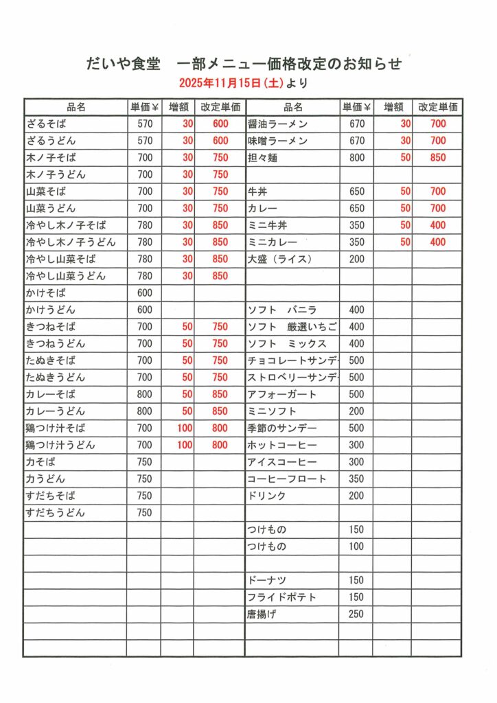 だいや食堂より 一部メニュー価格改定のお知らせ コメントする / 未分類 / By daiyagawa いつもだいや食堂をご利用いただき、誠にありがとうございます。 この度、昨今の原材料費、水道光熱費、物流費の高騰に伴い、誠に不本意ながら、2025年11月15日(土)より一部メニューの価格を改定させていただきます。お客様にはご負担をおかけし、大変申し訳ございませんが、今後もお客様にご満足いただける、より良いサービスを提供できるよう努めてまいります。何卒ご理解いただけますよう、よろしくお願い申し上げます。 日光だいや川公園 だいや食堂 改定内容はこちらをご確認ください