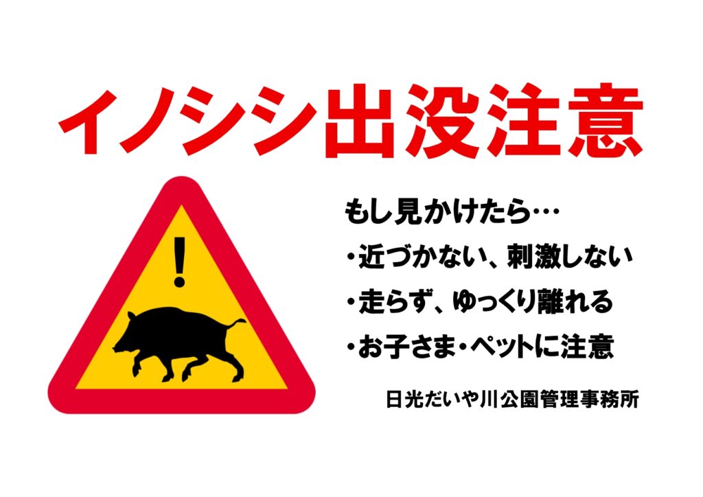 公園内でのイノシシ出没について(ご来園の皆様へのお願い) コメントする / 未分類 / By daiyagawa 3/10(火)昼頃、イノシシの目撃が複数確認されました。イノシシは普段おとなしい動物ですが、驚かせたり追い詰められたりすると、思わぬ行動をとることがあります。ご来園の皆様が安全にお過ごしいただけますよう、以下の点にご注意ください。 イノシシを見かけた際の注意事項・近づかない、刺激しない(大声を出す、フラッシュ撮影、石を投げるなどは危険です。)・走って逃げない(追いかけられる可能性があります)・背を向けず、ゆっくり距離をとる・お子様やペットを近づけない・エサやりは絶対にしない。 補足情報・公園スタッフが巡回し、安全確認を行っています。・イノシシを目撃した場合は無理に追い払わず、最寄りの公園施設スタッフや管理事務所までご連絡ください。・夕方や早朝は遭遇しやすいので、園内散策の際は特にご注意ください。 日光だいや川公園管理事務所 0288-23-0111